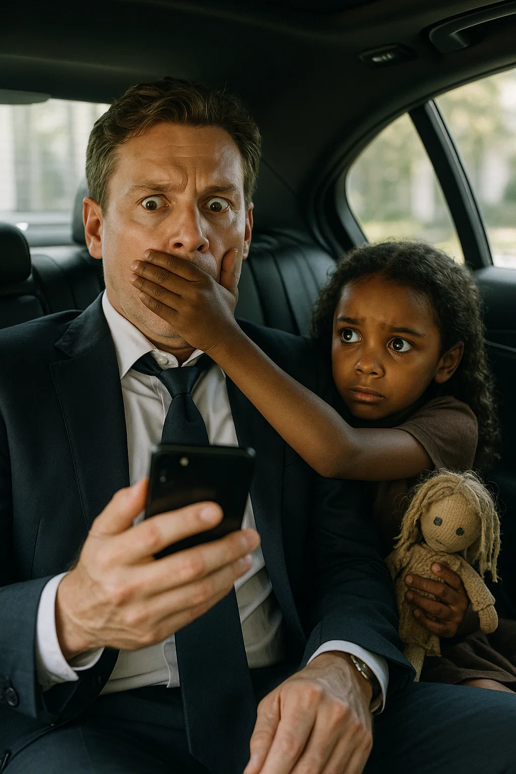 Jonathan straightened abruptly. In the mirror — nothing. He slowly turned his head and noticed a little girl, about seven years old, sitting in the corner of the car: dark skin, cautious eyes, a doll in her hands.